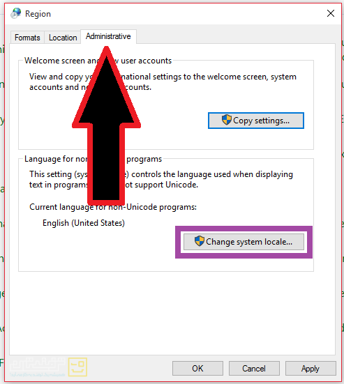 4-سپس (ترفندستان) به برگهی آخر یعنی Administrative رفته و بر روی دکمه Change system locale کلیک کنید.