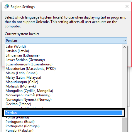5-در اخطار ظاهرشده روی Apply کلیک کرده و از کشوی Current system locale گزینهی Persian را انتخاب کرده و روی OK کلیک کنید.
